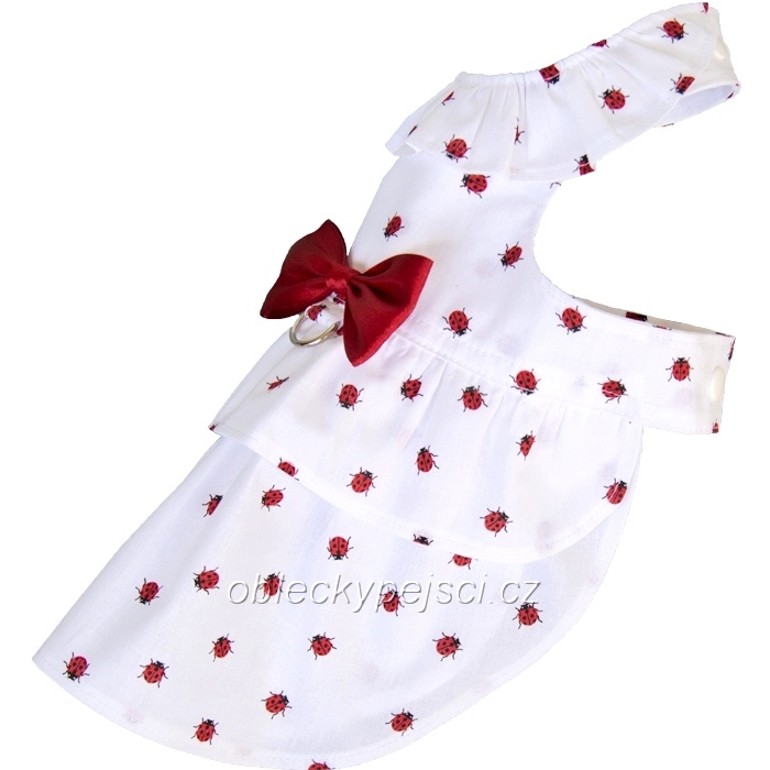 Krásné, bavlněné, bílé šatičky s malými červenými beruškami, zdobené červenou, saténovou mašlí pro malé psí parádnice - vhodné i pro slavnostní události