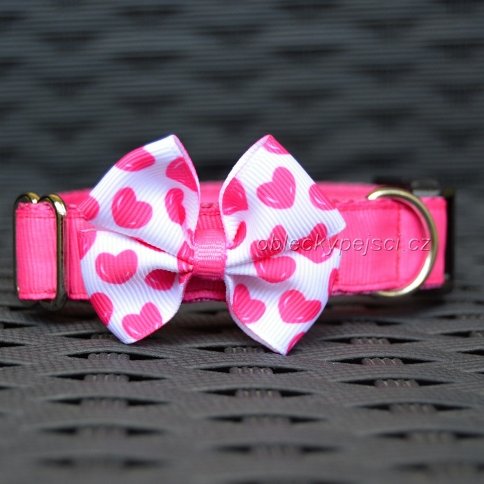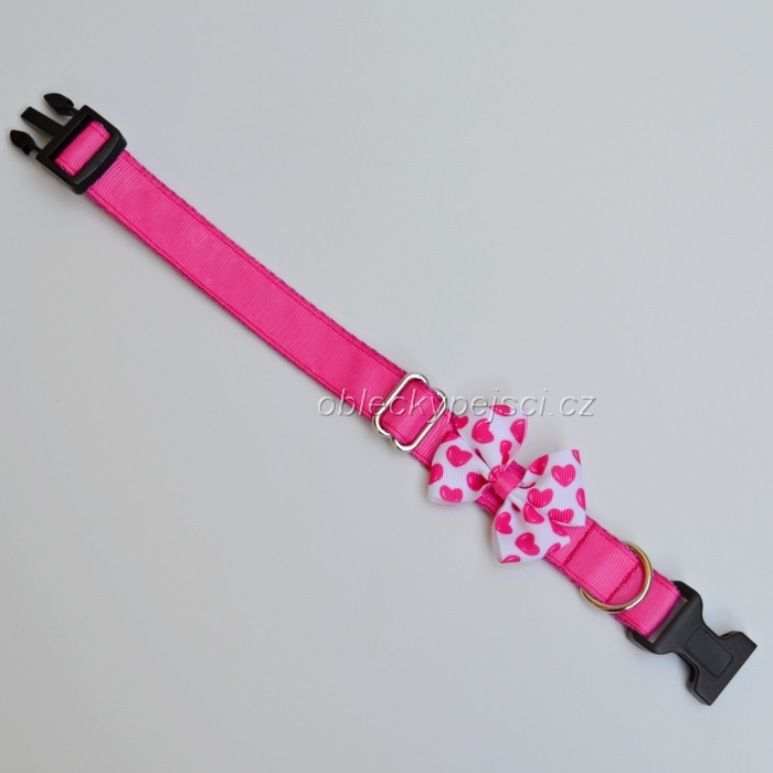 Růžový obojek s bílou mašličkou s růžovými srdíčky v šíři 2 cm