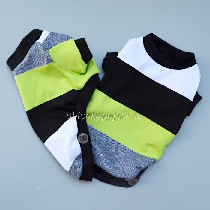 - ušité je z příjemného,jemného, pružného bavlněného úpletu s motivem barevných pruhů (jasně zelená, černá, bílá, šedý melír)