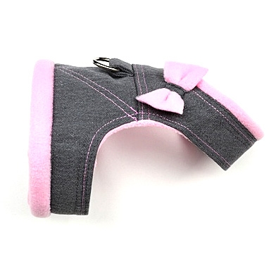 Kšíry jsou ušité ze šedé, měkké džínoviny, podšité světle růžovým hřejivým, naprosto měkkým microfleecem. Na zádech mají všitý polokroužek pro připnutí vodítka a zdobí je malá přišitá mašlička. Zapínají se pod krkem a hrudi na suché zipy, které dobře drží (díky suchým zipům se dá regulovat velikost kšír). Kšíry využijí i štěňátka, která rychle rostou, také i pejskové co nemají rádi obojky.