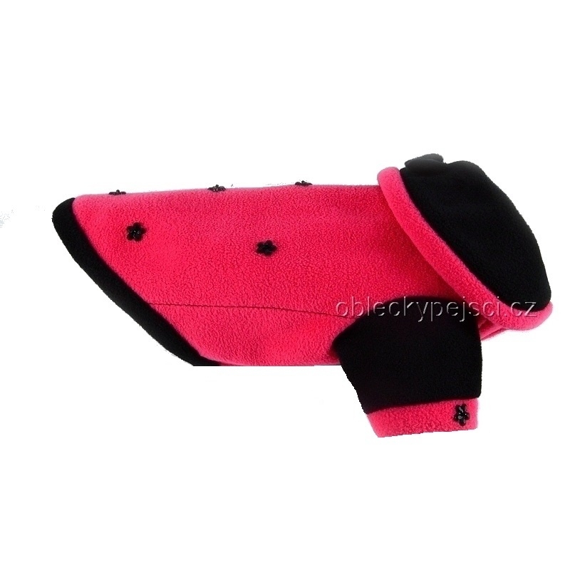 Mikina je ušitá z měkkého, velmi příjemného flecee v kombinaci sytě růžové a černé barvy. Na límci je přišitá malá černá mašlička, záda a rukávky zdobí ručně přišité černé kytičky. Zapíná se na bříšku pomocí černých druků.