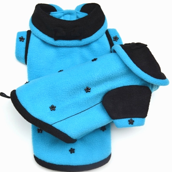 Mikina je ušitá z měkkého, hřejivého flecee v kombinaci modré a černé barvy. Na límci je přišitá černá mašlička, na zádech a rukávkách jsou ručně přišité černé kytičky. Mikina se zapíná na hrudi pomocí suchých zipů, v délce je přišitá gumička na ocásek. Fenečkám mikina chrání celé bříško a pro psí kluky s větším vykrojením na bříšku.
