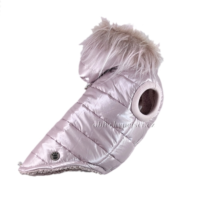 Luxusní velmi teplá pudrově růžová bunda s krásnou kožešinkou pro náročné psí holky + přívěsek s kamínkem ZDARMA