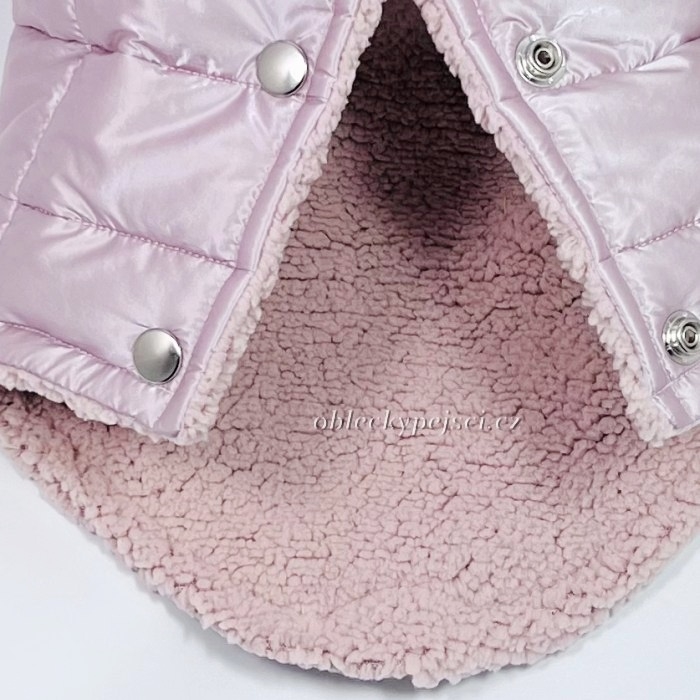 - ušitá je z velmi kvalitního teplého zimního, částěčně nepromokavého, šusťákového proševu z decentně matným leskem, podšitá hebkou a hřejivou sherpou ve světle pudrově růžové barvě