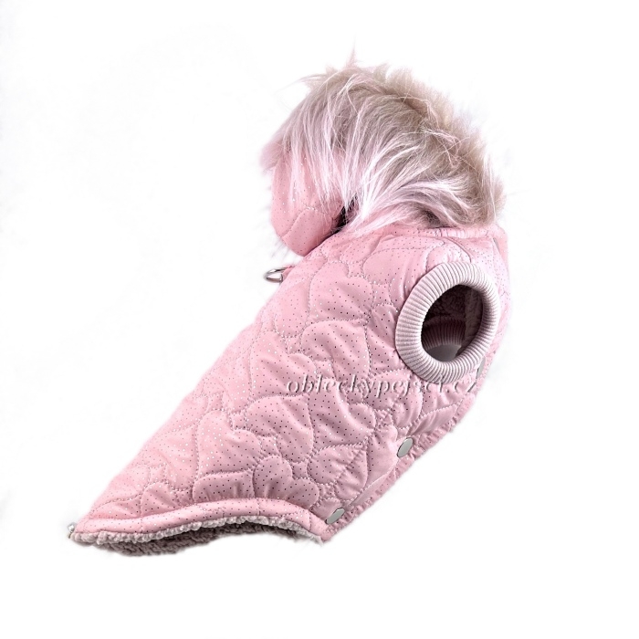 Krásná luxusní bunda s kožešinkou pro malé psí parádilky v růžové barvě se srdíčky + krásný přívěsek s kamínky ZDARMA