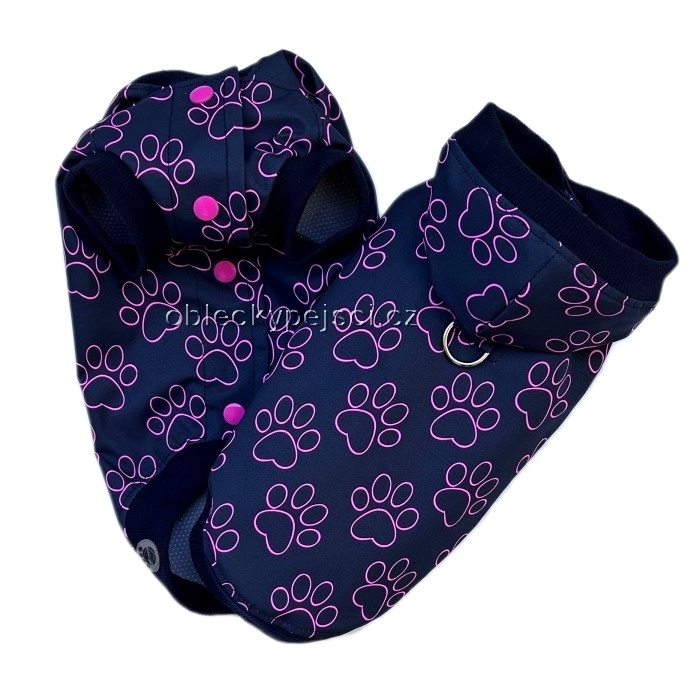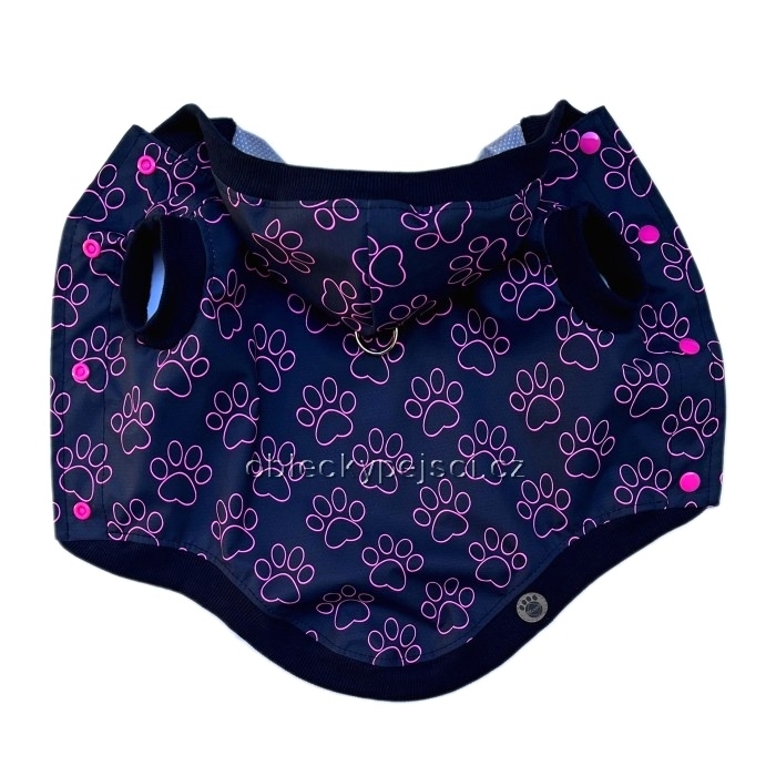 - ušitá je z krásného letního černého softshellu s potiskem růžových tlapiček, tento softshell je velmi lehký - neprofoukne, nepromokne a přesto je prodyšný