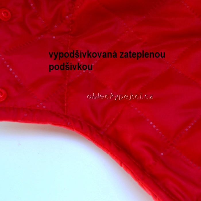 - ušitá je ze slabého do jisté míry voděodolného, velmi měkkého, příjemného proševu, vypodšívkovaná zateplenou červenou podšívkou