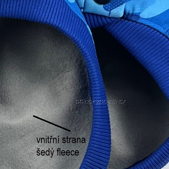 - ušitá je ze zimního softshellu, který má z rubové strany šedý fleece v kombinaci královsky modrých nápletů