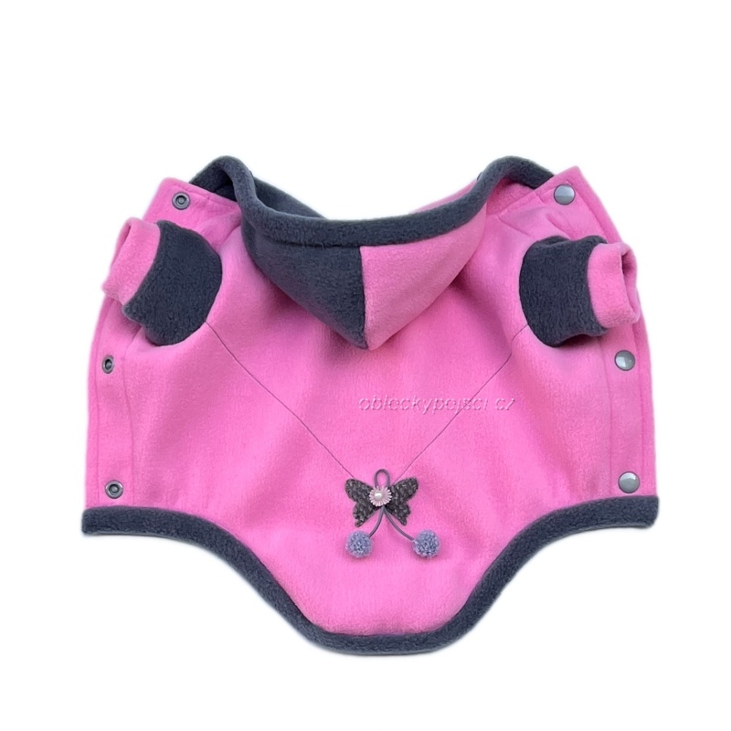 - ušitá je ze středně růžového kvalitního fleece v kombinaci šedého fleece, který je velmi příjemný, mírně pruží a vaší fenečku hezky zahřeje