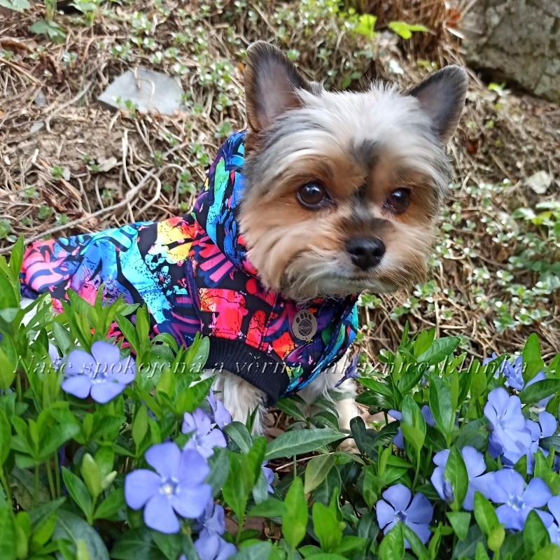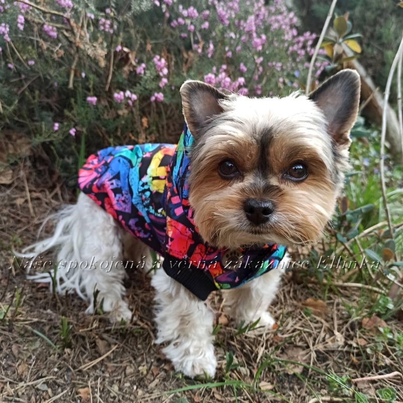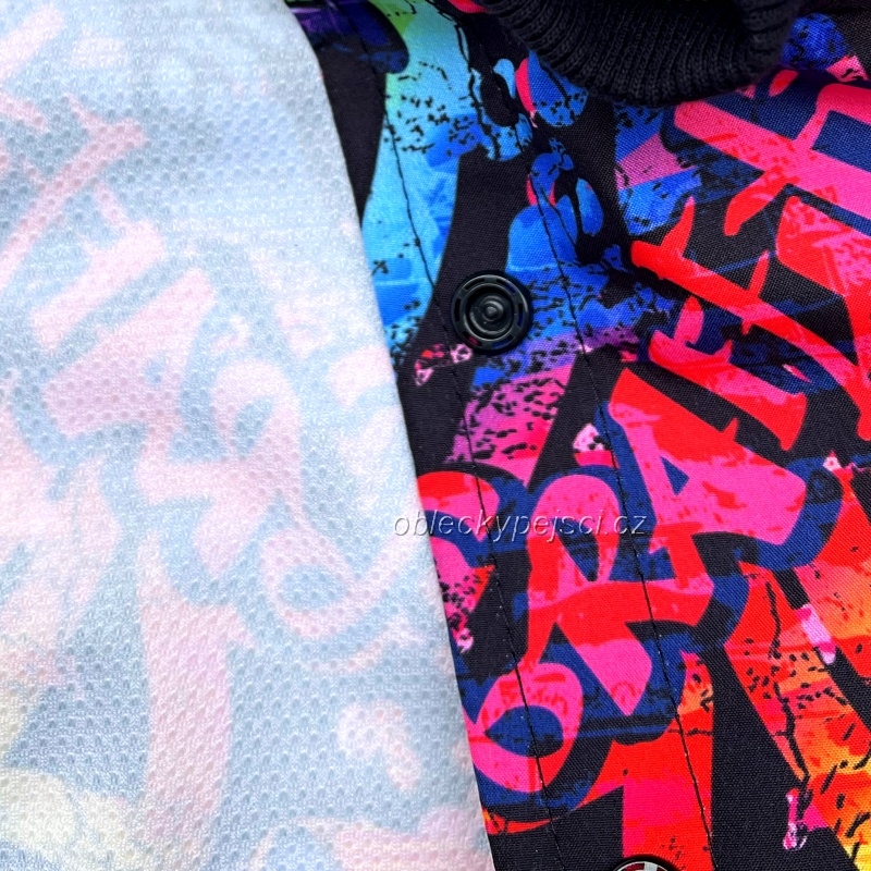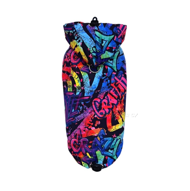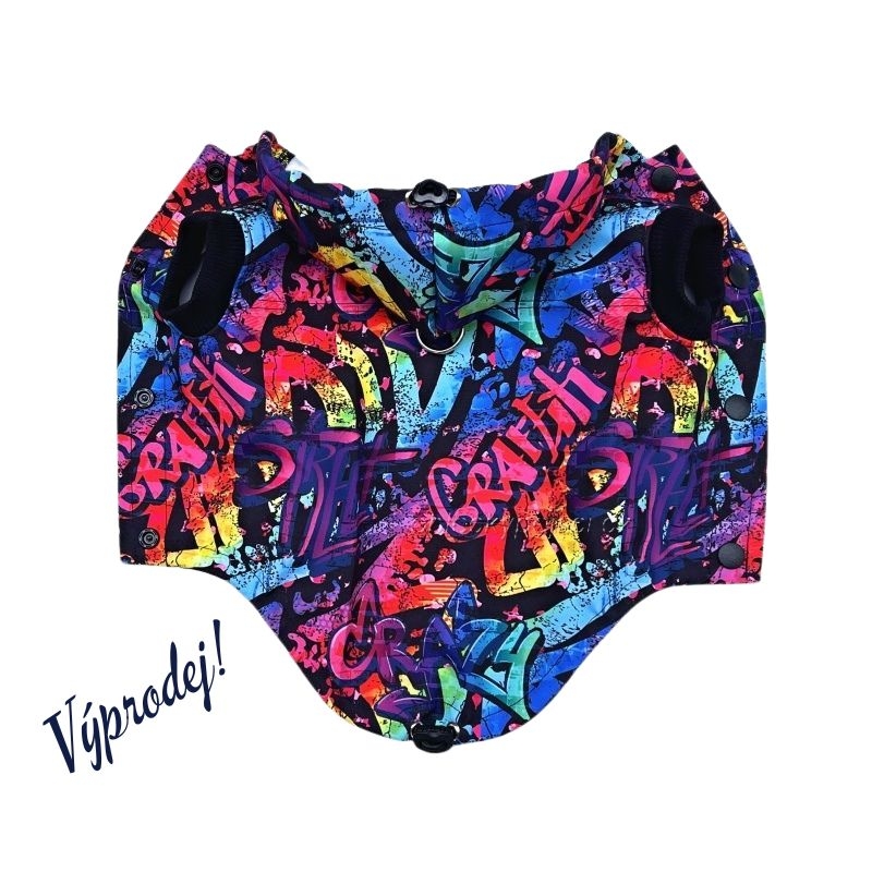 - ušitá je z krásného, kvalitního, lehkého, letního softshellu s barevným potiskem graffiti, kterou díky lehkosti vaše fenečka na sobě ani neucítí