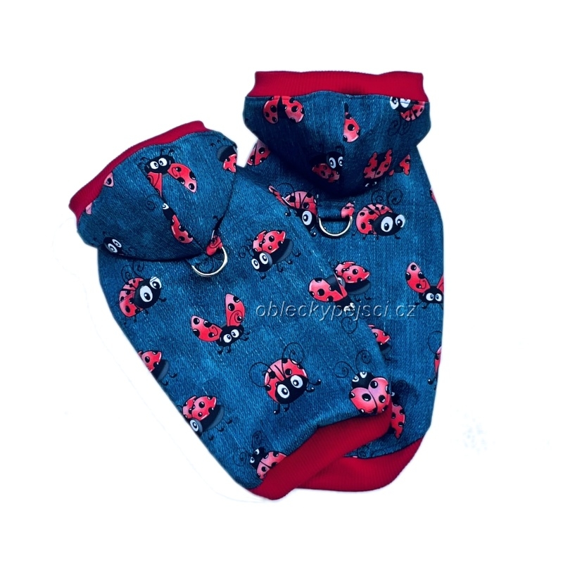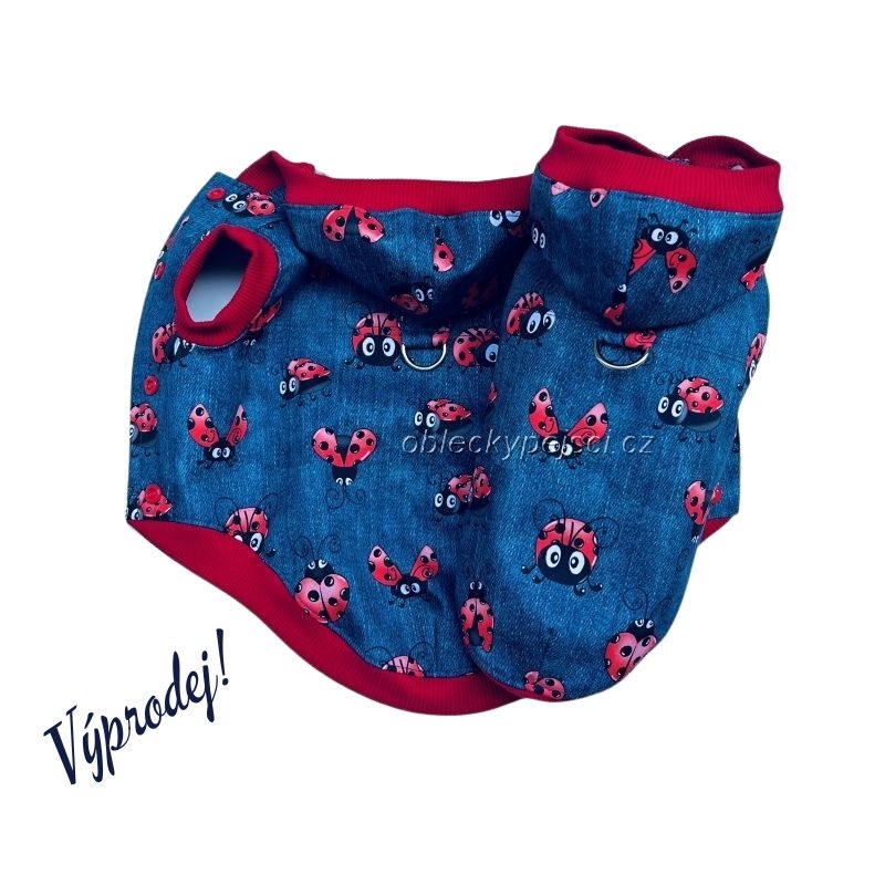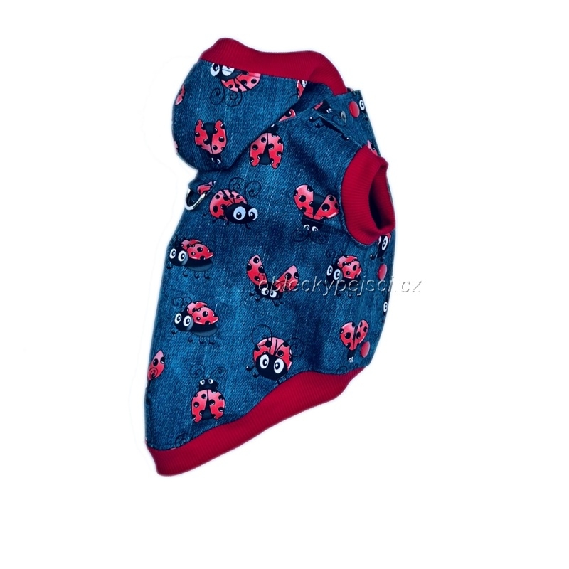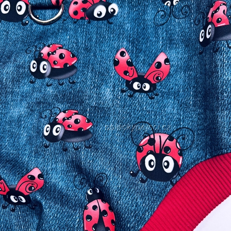 - ušitá je z kvalitního, lehoučkého letního softshellu se vzorem džínoviny a potiskem červených létajících berušek (tento softshell nepromokne, neprofoukne a přesto je prodyšný)