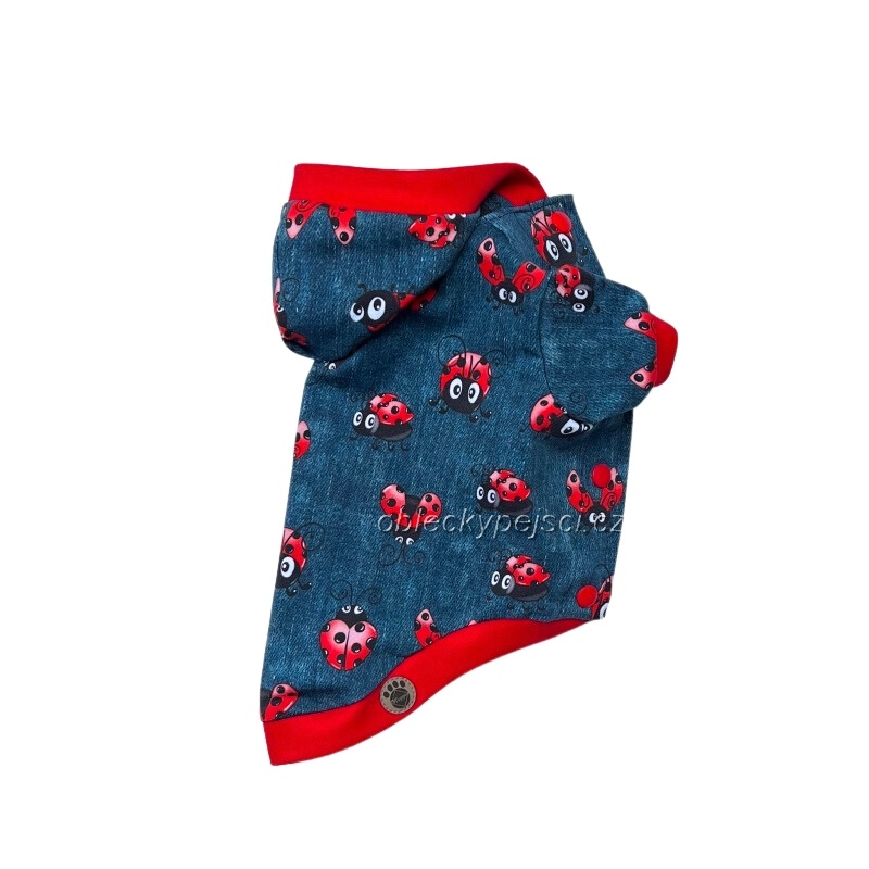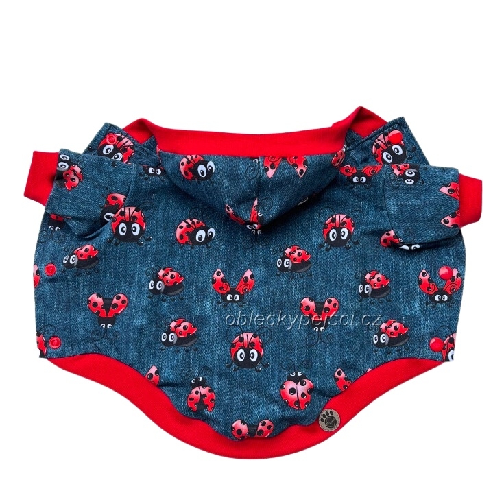 - ušitá je ze slabší, pružné, nepočesané teplákoviny se vzorem modré džínoviny a potiskem červených létajících berušek v kombinaci červených nápletů