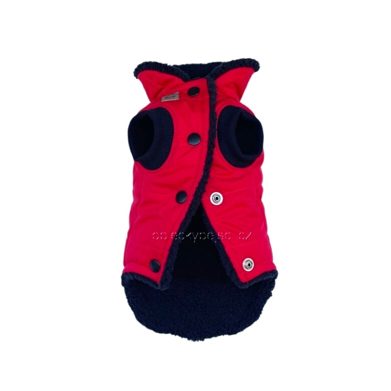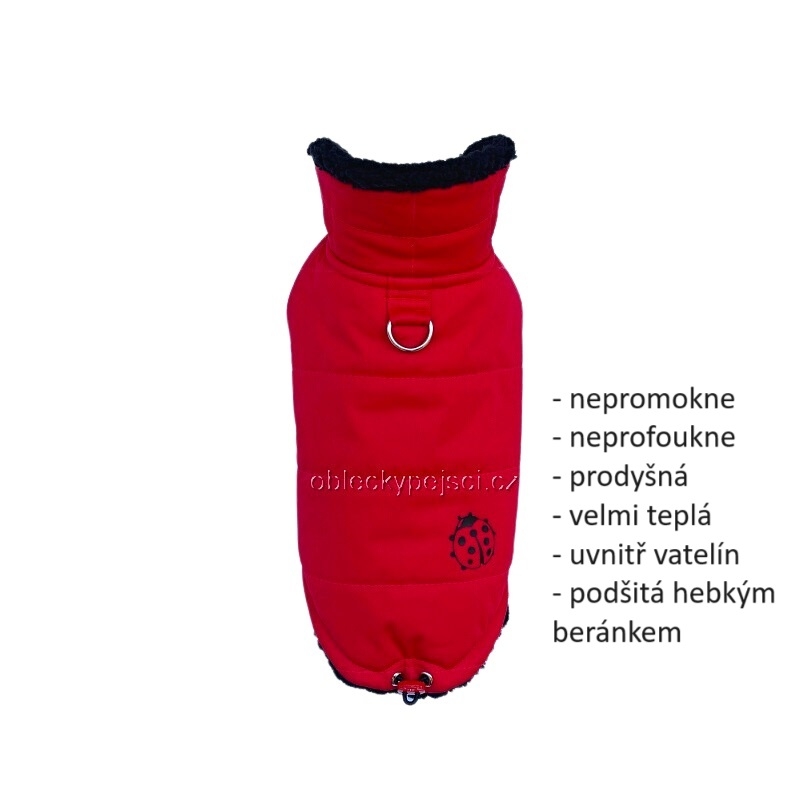 - ušitá je z příjemného sytě červeného softshellu, který nepromokne, neprofoukne a přesto je prodyšný, uvnitř zateplená vatelínem a vypodšívkovaná kvalitní heboučkou a teplou černou sherpou - beránkem