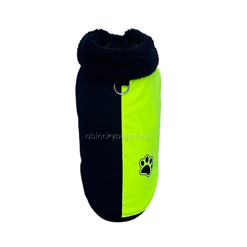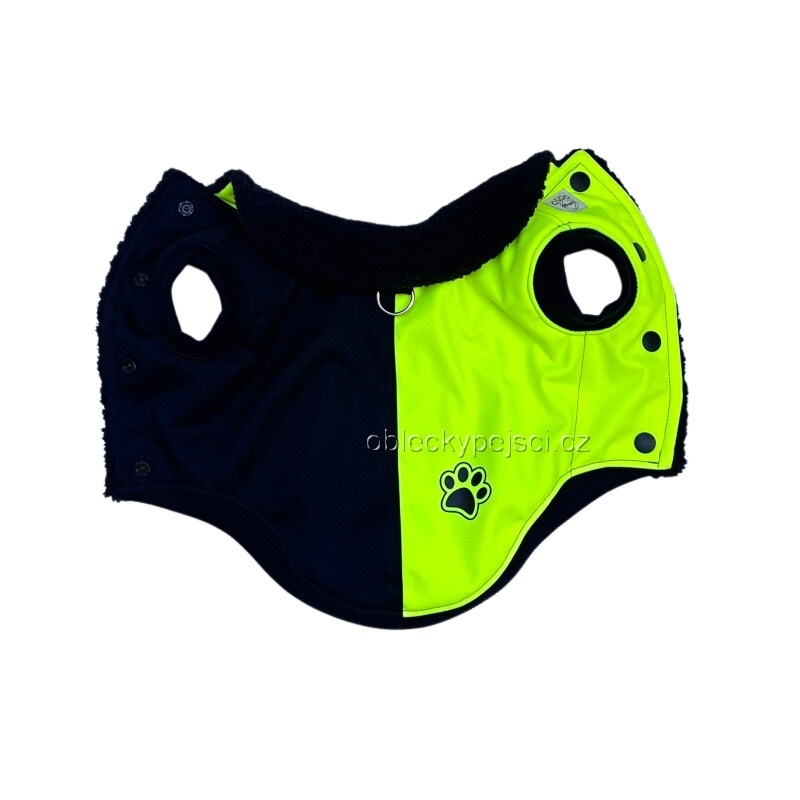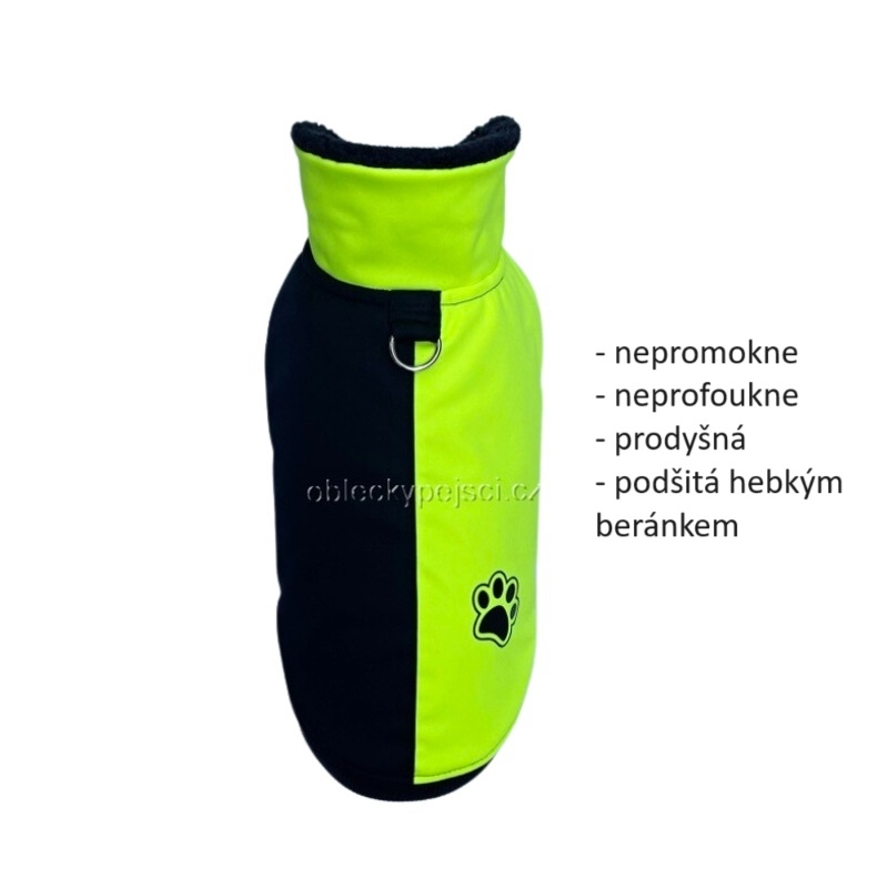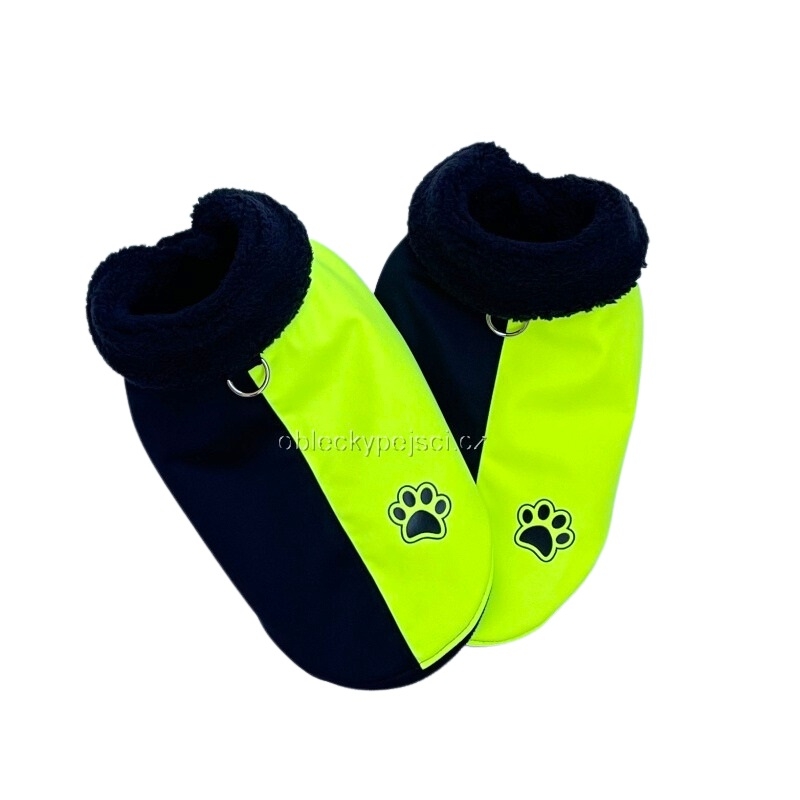 Výrazná zimní softshellová bunda v kombinaci černé a neon žluté barvy pro malé psí holky