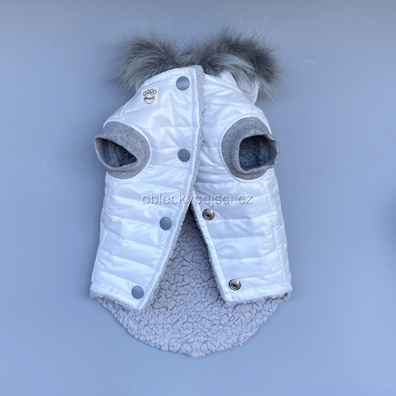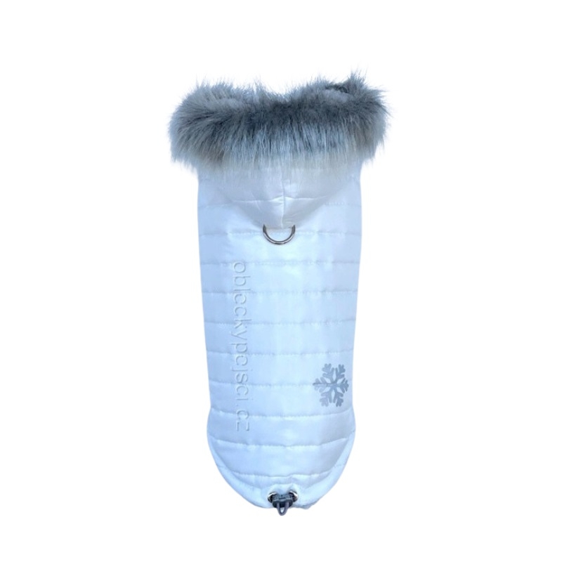 Luxusní bílá bunda s kožešinkou a reflexní vločkou pro malé psí parádilky do zimních dní