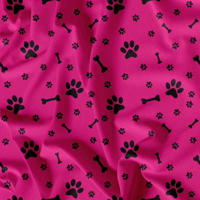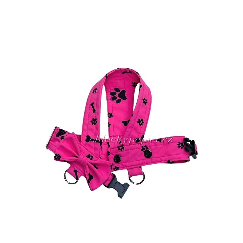 Růžové softshellové kšíry s motivem černých tlapek a kostí, které zdobí krásná mašlička na zádech ideální do jarních a letních dní - pro malé fenečky jsou velmi pohodlné