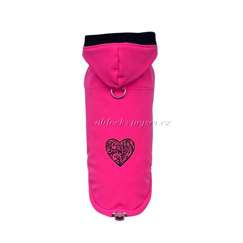 Výrazná softshellka v neonově růžové barvě s krásnou aplikací na zádech ve tvaru srdíčka s ornamenty pro malé psí holky od jara až do zimy