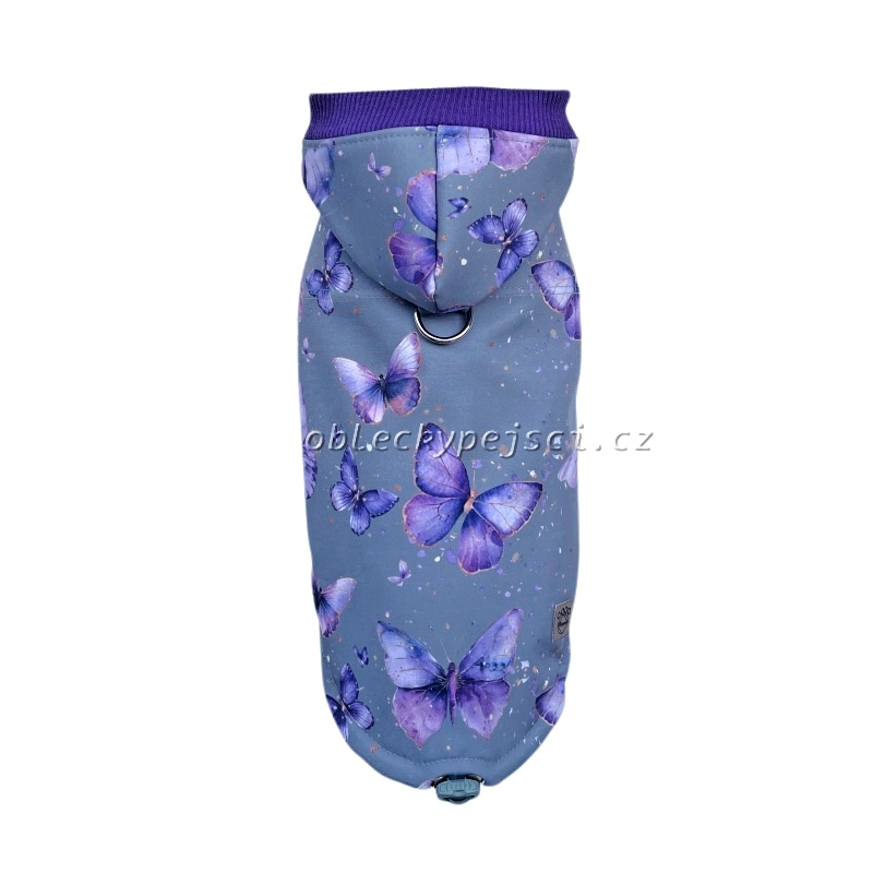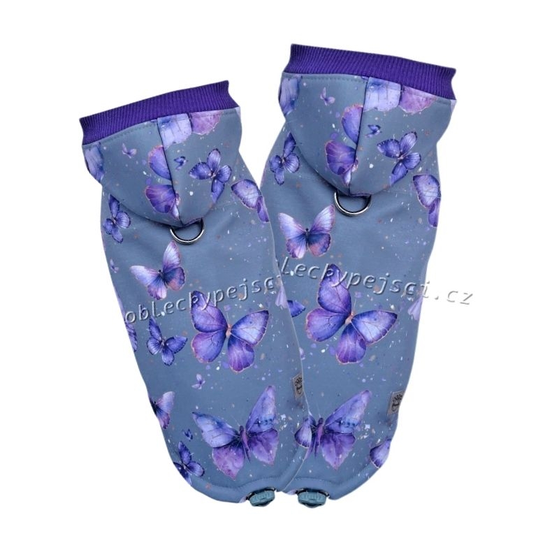 Softshellová šedá bunda s krásným potiskem fialových motýlků pro malé psí holky, kterou využijí od jara až do zimy