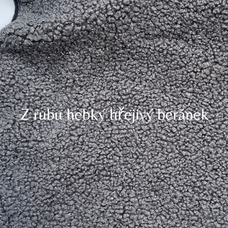 - ušitá je ze slabšího, šusťákového, voděodolného, zimního proševu(uvnitř tenký vatelín) podšitá kvalitním, hřejivým, hebkým beránkem