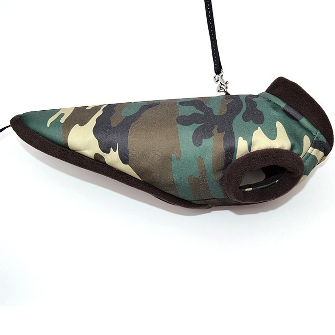 Vyrobená je ze silné kvalitní šusťákoviny zateplená tenkým vatelínem a vypodšívkovaná tmavě hnědým teplým, měkkým polarfleecem.Všitý stojáček, olemování průramků a délky jsou rovněž z hnědého fleece. Na zádech má všitý polokroužek pro připnutí vodítka, tím odpadá nutnost ještě připínání obojku.