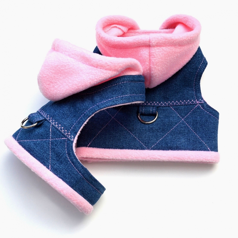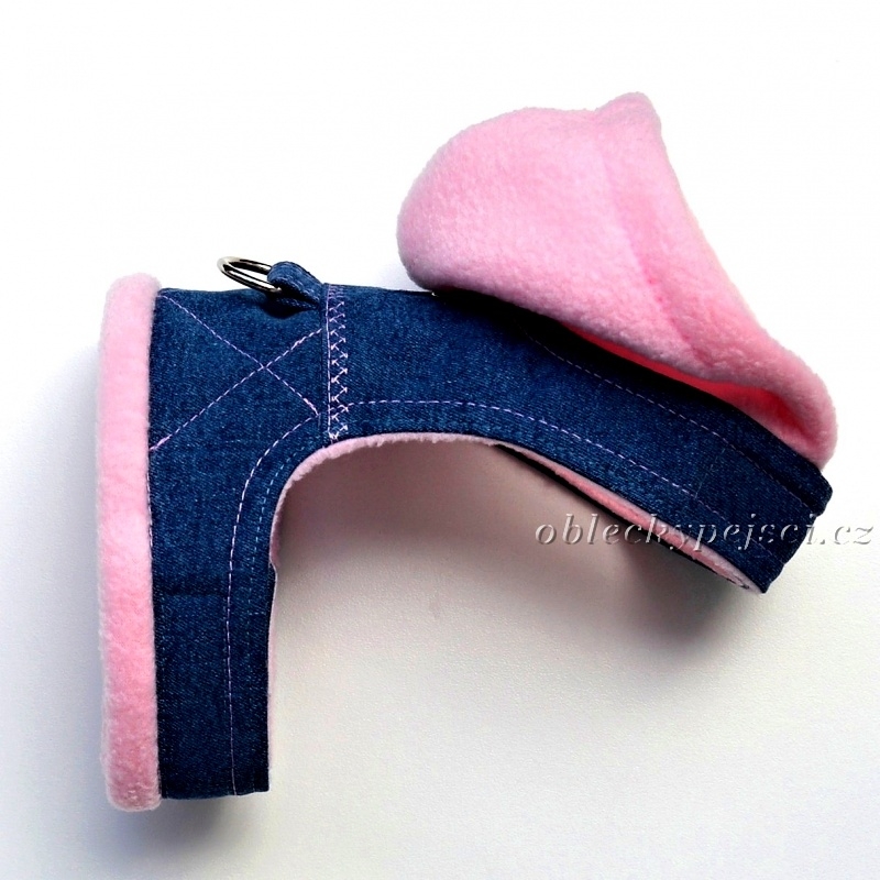 Kšíry jsou ušité z modré měkké džínoviny, podšité světle růžovým, příjemným fleecem, který Vašeho pejska krásně zahřeje. Všitá malá kapuce je rovněž z fleece, která slouží pouze designově ( pod ní je přišitá malá patentka, aby kapuce držela při pohybu pejska na svém místě.) Na zádech je všitý polokroužek, pro připnutí vodítka.