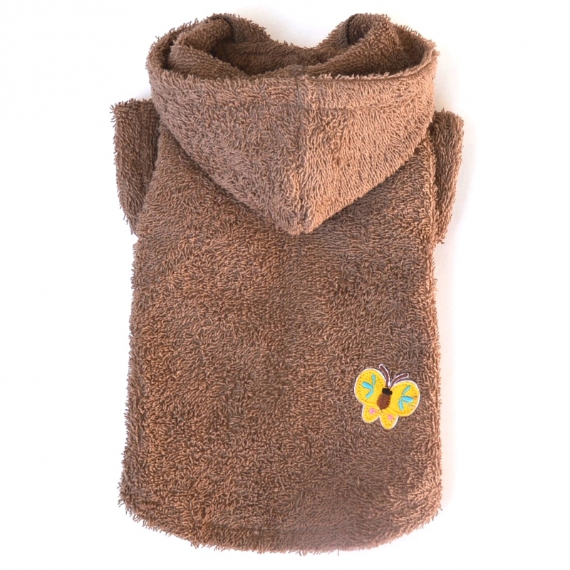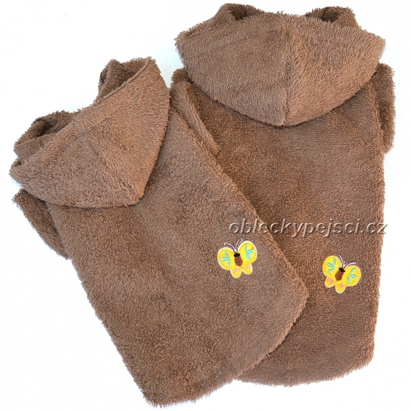 Hezký, světle hnědý froté župan je ideální pro vaše pejsky po koupání, ale můžete využít i pro vysušení pejska po deštivých procházkách či zahřátí v chladných dnech. Župan se zapíná na hrudi pomocí hnědých patentů. Záda županu zdobí našitý malý žlutý motýlek.