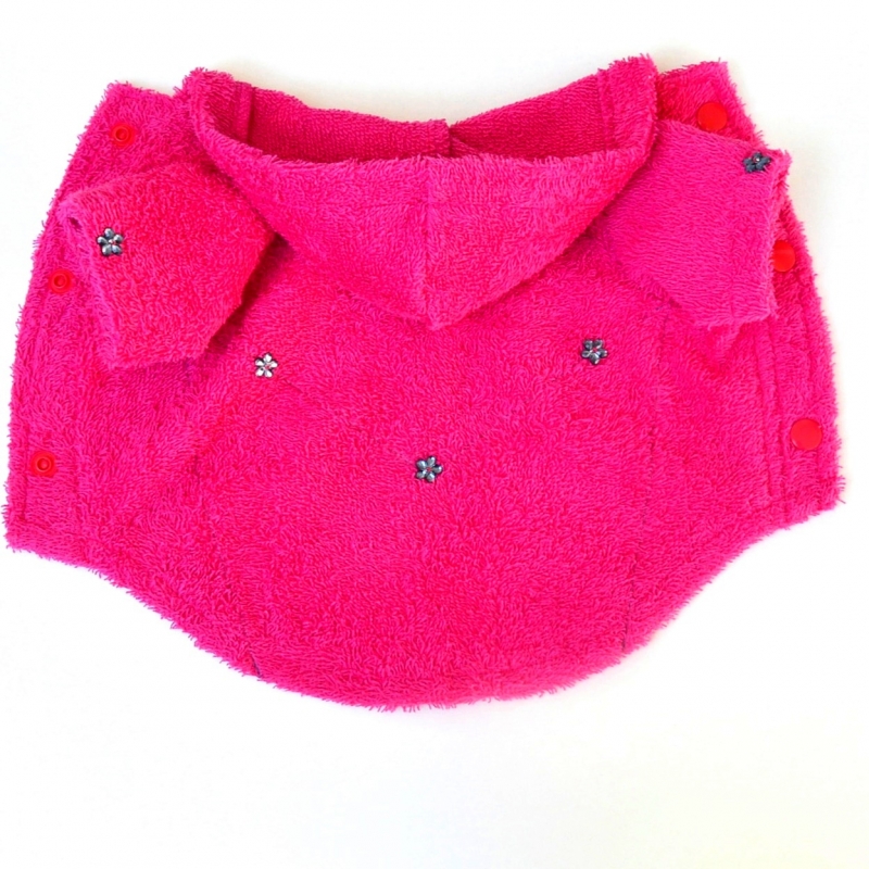 Hezký, sytě růžový froté župan je ideální pro vaše pejsky po koupání, ale můžete využít i pro vysušení pejska po deštivých procházkách či zahřátí v chladných dnech. Župan se zapíná na hrudi pomocí růžových patentů. Záda županu zdobí šedé štepování s našitými malými šedými kytičkami, které je přišité i na rukávkách.