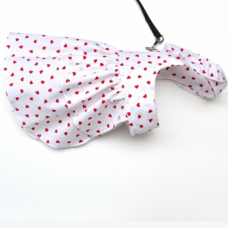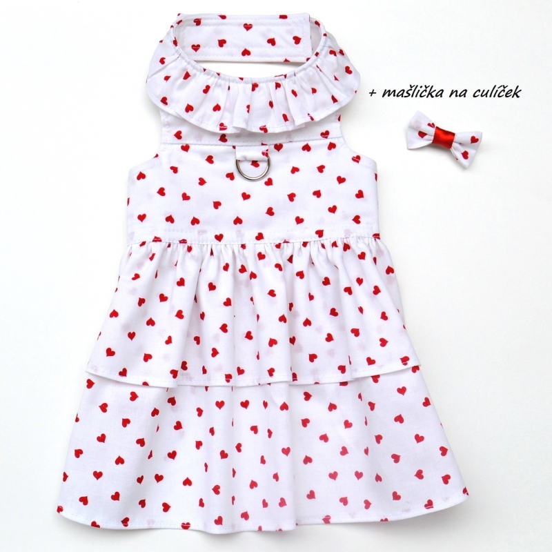 Bílé šaty s červenými srdíčky a malou mašličkou na culíček pro malé psí parádnice.