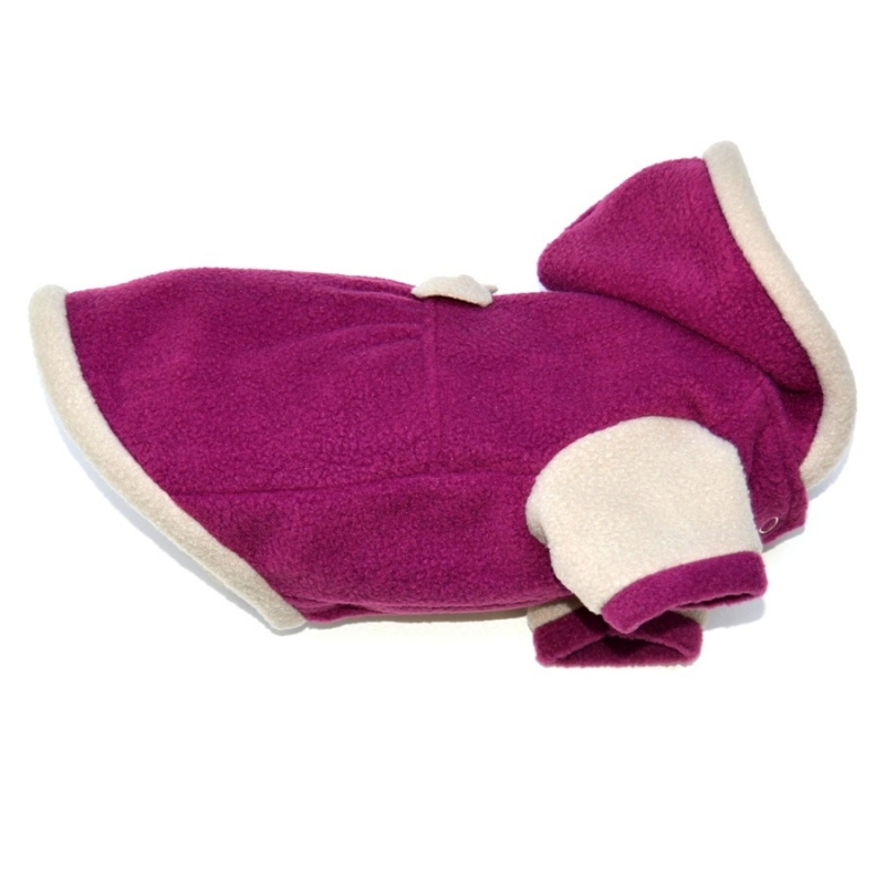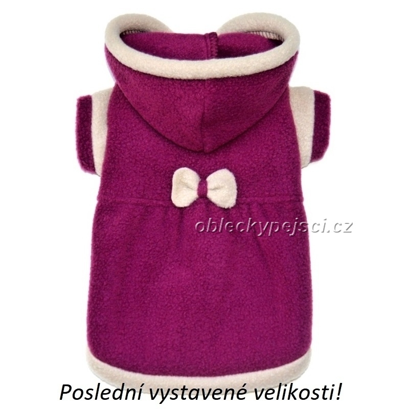 Velmi hezká fleecová mikina v kombinaci vínovo-fialového a světle béžového, teplého fleece je ideální do chladných dnů. Mikina fenečkám chrání i celé bříško. Na zádech je přišitá malá mašlička, mikina se zapíná na bříšku na malé baby cvočky. Mikina nemá gumičku na ocásek, v případě, že by jste o ní měly zájem, připište do poznámky v objednávce.
