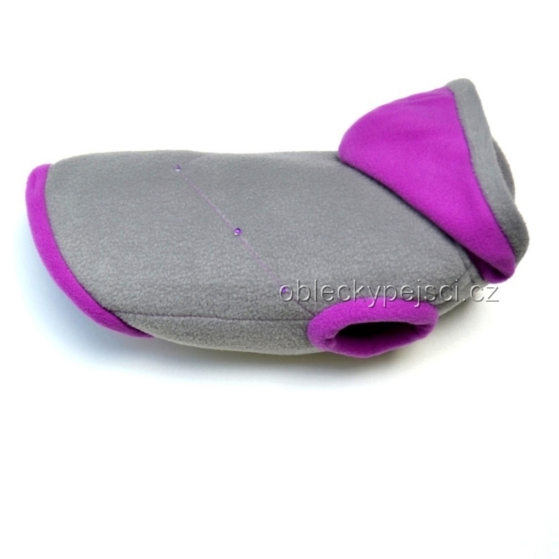 Teplá šedá mikina je ušitá z měkkého polarfleece v kombinaci fialkového ze kterého je kapuce, olemování průramků a délky. Tato mikina fenečkám ochrání i celé bříško. Záda jsou zdobně proštepované a jsou na nich přišité malé fialové korálky. Mikina se zapíná pomocí suchých zipů na bříšku. V délce je přišitá gumička na ocásek.