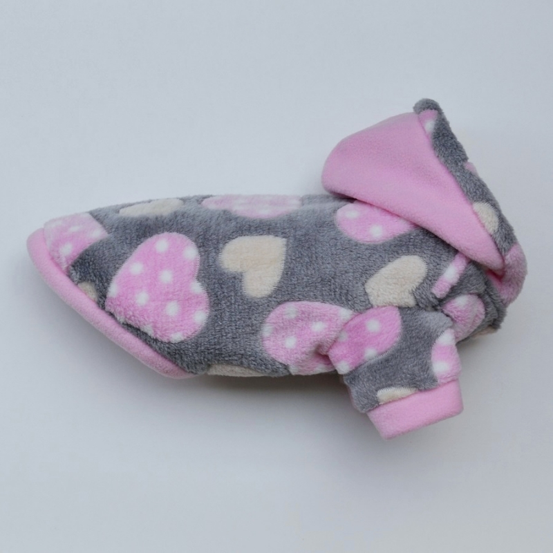 Krásně měkká mikina je ušitá z hebkého, velmi příjemného srdíčkvého coral fleece, díky tomuto materiálu v ní bude vaše fenečka jako v bavlnce. Kapuce a olemování délky a rukávků je z příjemného, měkkého, světle růžového microfleece. Mikina se zapíná na bříšku pomocí suchých zipů, a fenečkám pokryje i celé bříško. V délce není přišitá gumička na ocásek.