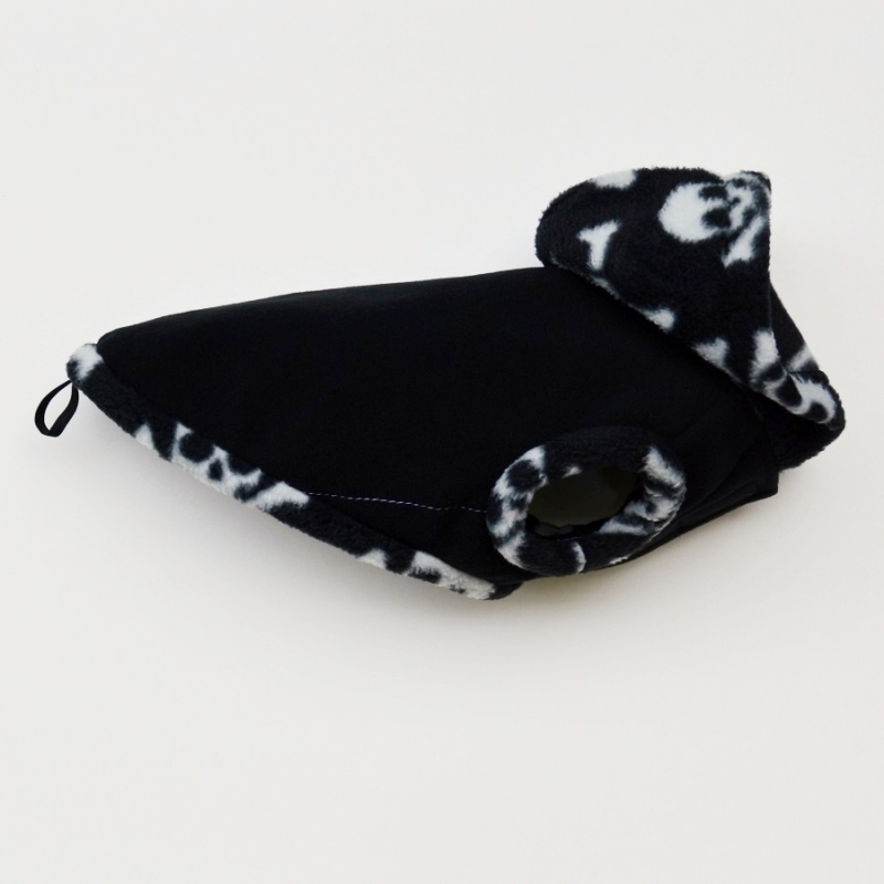 Hezká a velmi teplá, měkká mikina je ušitá z teplého silného polarfleece, kapuce, olemování délky a průramků je z černého fleece z bílými lebkami. V délce je přišitá gumička na ocásek. Mikina se zapíná pomocí suchých zipů na bříšku.
