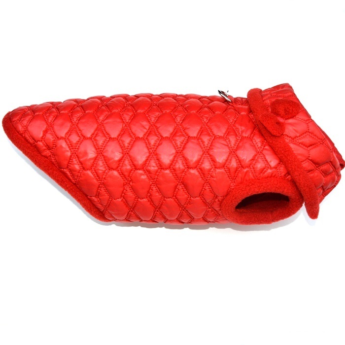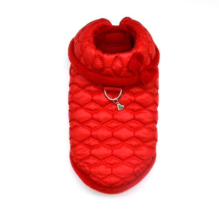 Na zádech je přišitý polokroužek pro připnutí vodítka, proto již nemusíte ještě připínat obojek, jen bundu pejskovi obléknete a vyrazíte ven. Límec zdobí přišitá malá čevená mašlička.