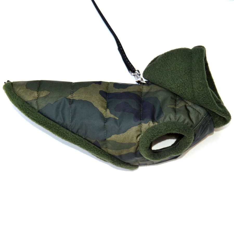 Bunda je ušitá ze zeleného maskáčového, nepromokavého proševu, vypodšívkovaná černou podšívkou, olemování průramků, délky a všitá kapuce je z tmavě zeleného fleece. Na zádech je přišitý polokroužek pro připnutí vodítka. Bunda se zapíná na bříšku pomocí suchých zipů, díky nim můžete regulovat velikost. Pod kapucí je přišitá malá patentka, aby kapuce držela při pohybu pejska na svém místě. V délce je provlečená gumička pro stažení, tak aby pejskovi bunda dobře držela na těle. Bunda je lehká a teplá, vašeho pejska nijak nezatíží.