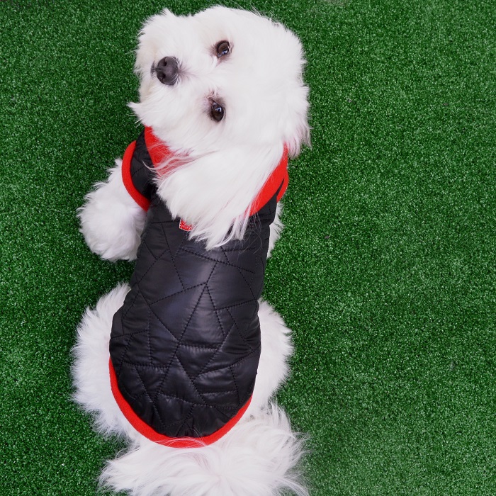 Zimní bunda Černo - červená s kapucí pro malé psí holky a kluky + krásný červený přívěsek s kamínky ve tvaru srdíčka zdarma!