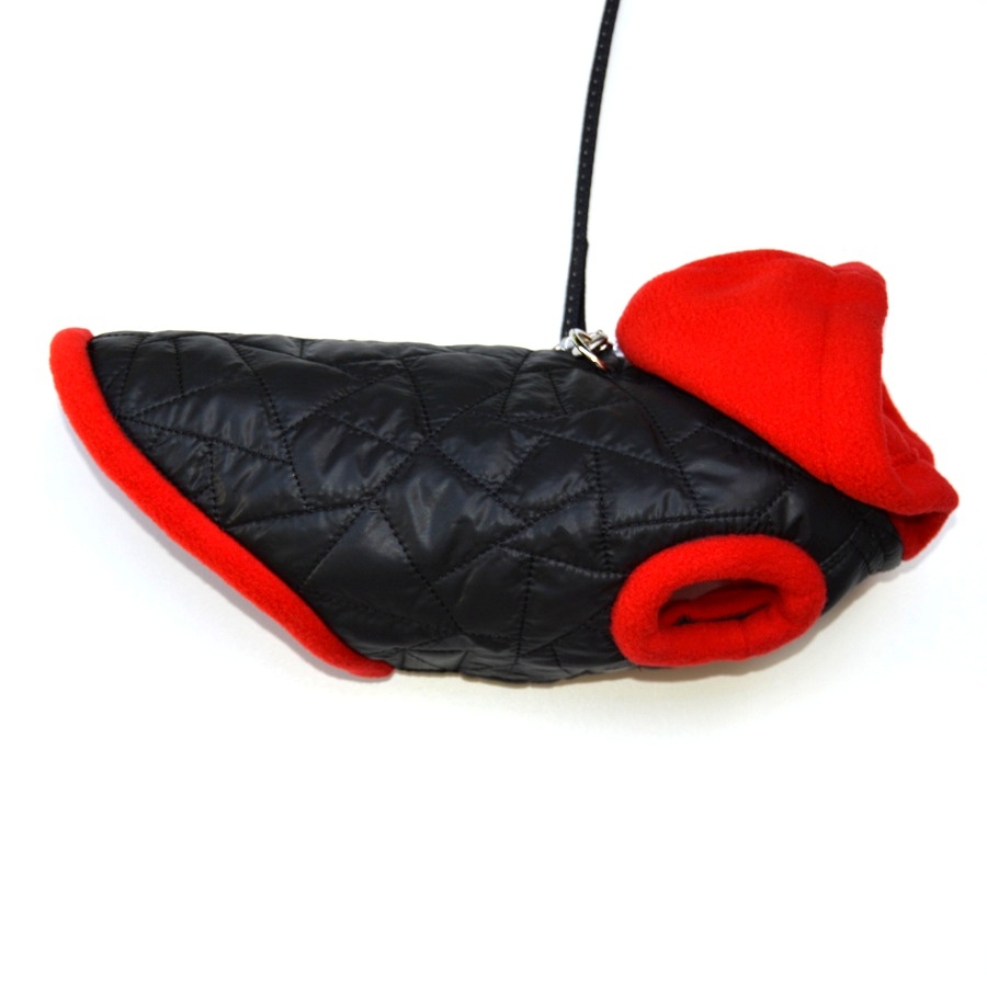 Krásná zimní bunda je ušitá ze slabšího, černého proševu, vypodšívkovaná červeným, teplým, kvalitním fleecem, ze kterého je i kapuce, olemování průramků a délky. Na zádech je přišitý polokroužek pro připnutí vodítka, tím odpadá nutnost ještě připínání obojku - stačí bundu obléci a vyrazit ven. Pod kapucí je přišitá malá patentka, aby kapuce držela na svém místě. Bunda se zapíná na bříšku pomocí suchých zipů, díky nim můžete regulovat velikost. Bunda chrání fenečkám celé bříško, pro psí kluky s větším vykrojením na bříšku