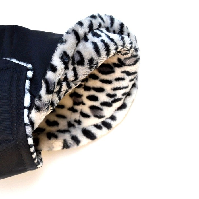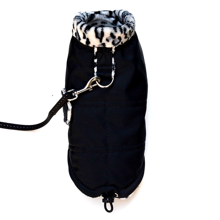 Hezká zateplená vesta je ušitá ze silnější, kvalitní, nepromokavé šusťákoviny a je podšitá naprosto příjemným hebce měkkým černo - bílým coralfleecem motivu tygra, z tohoto fleece je i všitý stojáček. Na zádech je přišitý polokroužek pro připnutí vodítka, tím odpadá nutnost ještě připínání obojku. Záda jsou černě proštepovaná. Vesta se zapíná pod krkem pomocí suchých zipů a na hrudi na pásek, který je rovněž podšitý tímto příjemným fleecem. Díky suchým zipům můžete regulovat velikost vesty. V délce je provlečená gumička na stažení, aby vesta dobře držela na těle pejska.