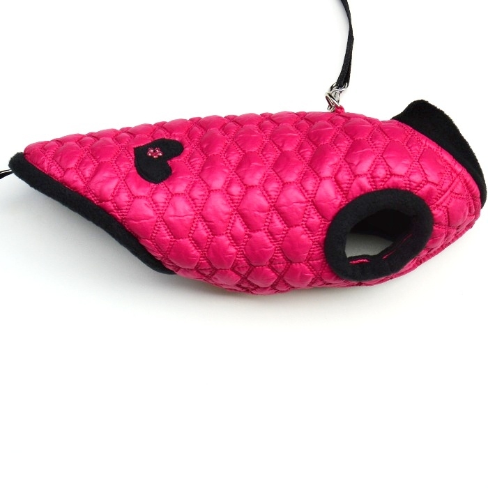 Krásná, výrazně růžová bunda se stojáčkem je ušitá z měkkého, příjemného proševu a je podšitá černým, teplým fleecem. Tímto fleecem je i olemování průramků, délky a všitý stojáček. V délce je přišitá gumička na ocásek. Na zádech je všitý polokroužek pro připnutí vodítka, tím odpadá nutnost ještě připínání obojku, stačí bundu obléci a vyrazit ven. Záda bundy zdobí přišité černé srdíčko zdobené růžovou kytičkou. Bunda se zapíná pomocí suchých zipů na bříšku, které jsou přišité tak, aby jste mohly regulovat velikost až o dva cm. Fenečkám bunda chrání celé bříško. V této bundě bude vaší fenečce příjemně a teplo.