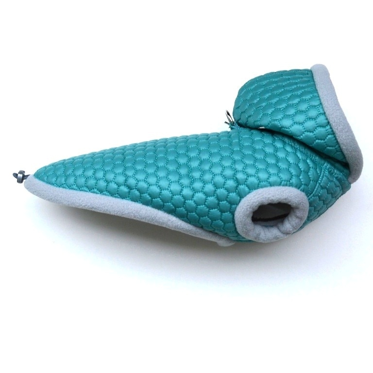 Zimní bunda je ušitá z teplého tyrkysově zeleného proševu a je podšitá kvalitním světle šedým, měkkým polarfleecem, ze kterého je i olemování průramků, délky a podšití celé kapuce. Pod kapucí je přišitá malá patentka, aby kapuce držela na svém místě. Na zádech bundy je přišitý polokroužek pro připnutí vodítka, tím odpadá nutnost ještě oblékání obojku. V celé délce je protažená gumička na případné stažení, aby bunda na těle pejska dobře seděla. Bunda se zapíná pomocí suchých zipů, díky nim můžete regulovat velikost viz.velikostní tabulka. V této bundě bude vašemu pejskovi příjemně a teplo.