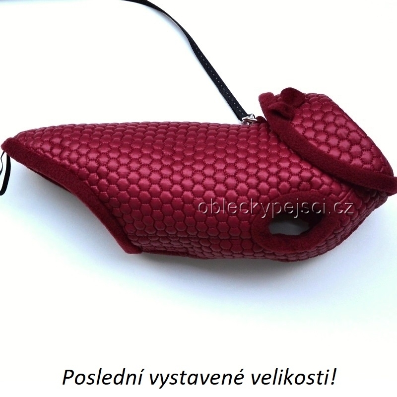 Krásná a teplá zimní bunda je ušitá z vínového šusťákového zatepleného proševu, vypodšívkovaná vínovým, hřejivým fleecem, ze kterého je i olemování límce, průramků a délky. Na zádech je přišitý polokroužek pro připnutí vodítka, tím odpadá nutnost ještě připínání obojku - stačí bundu obléci a vyrazit ven. Límec zdobí přišitá malá mašlička. Bunda se zapíná na bříšku pomocí suchých zipů, díky nim můžete regulovat velikost. Bunda chrání fenečkám celé bříško. V délce je přišitá gumička na ocásek. V této bundě bude vaší fenečce příjemně teplo.