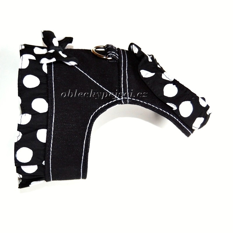 Kšíry jsou ušité z měkké černé džínoviny podšité černo - bílým bavlněným plátnem s puntíky, ze kterého jsou i všité volánky kolem krku, délky a také přišitá mašlička. Na zádech je všitý polokroužek pro připnutí vodítka. Kšíry se jednoduše zapínají pomocí suchých zipů pod krkem a hrudi, díky suchým zipům můžete regulovat velikost. Délka kšír je uvedena bez volánků. Tyto kšíry využijete i pro štěňátka, která rychle rostou.