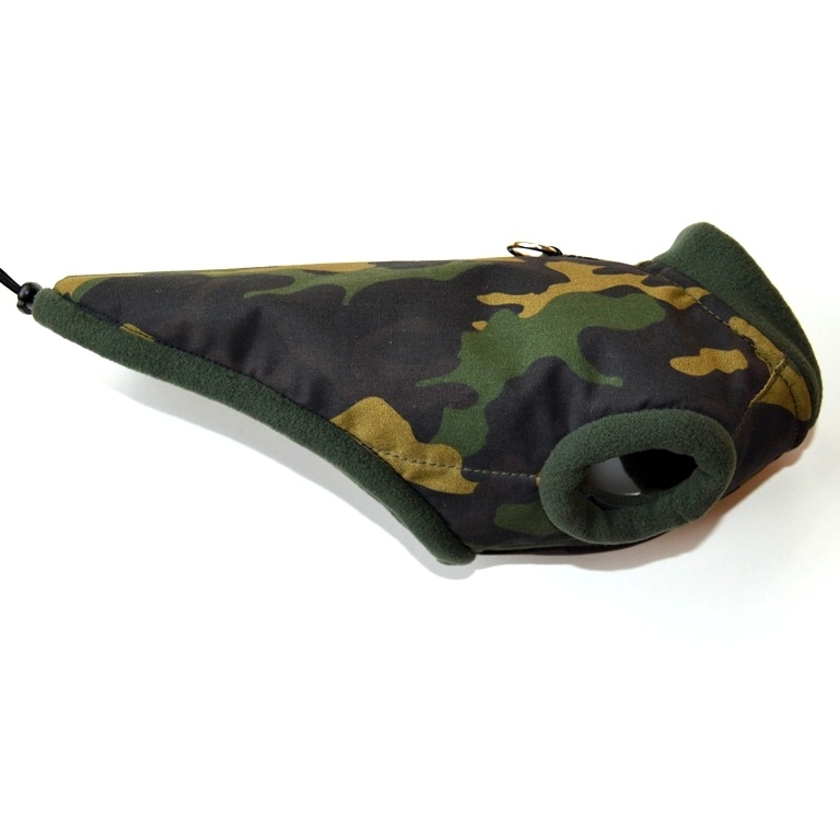 Bunda je ušitá z bavlněného plátna maskáčového vzoru, podšitá kvalitním, velmi příjemným khaki polarfleecem, za kterého je i všitý stojáček, olemování průramků a délky. V délce je protažená gumička pro případné stažení, tak aby bunda dobře držela na těle pejska. Na zádech je přišitý polokroužek pro připnutí vodítka, tím odpadá nutnost ještě použití obojku. Bunda se zapíná na hrudi pomocí suchých zipů, díky nim můžete regulovat obvodové míry, viz. velikostní tabulka.