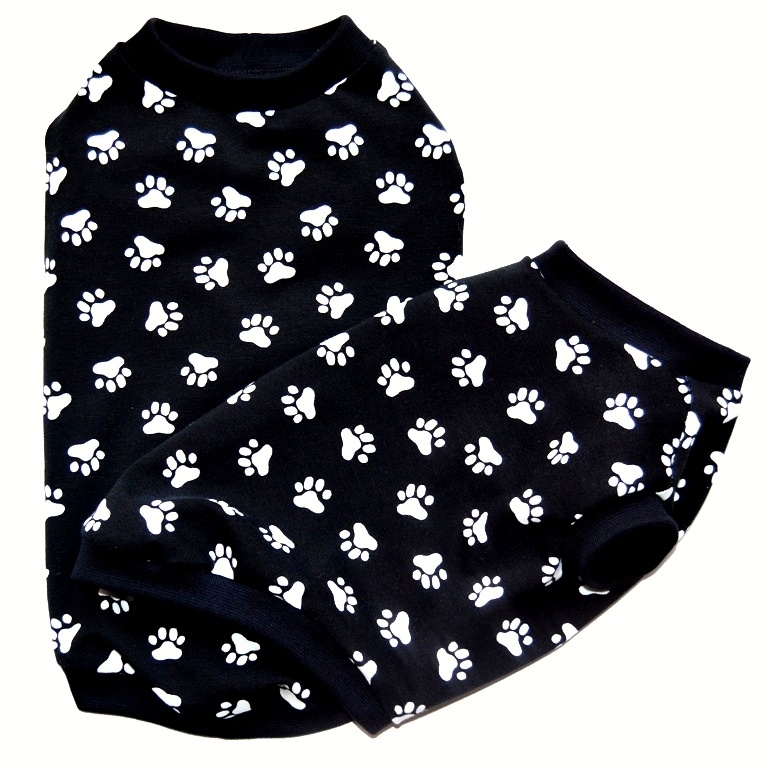 Krásné, černé tričko s motivem bílých tlapiček je ušité z příjemného bavlněného úpletu s černými náplety kolem krku, délky a průramků. Triko nemá zapínání, jen se obléká přes hlavičku pejska. Fenečkám pokrývá celé bříško.