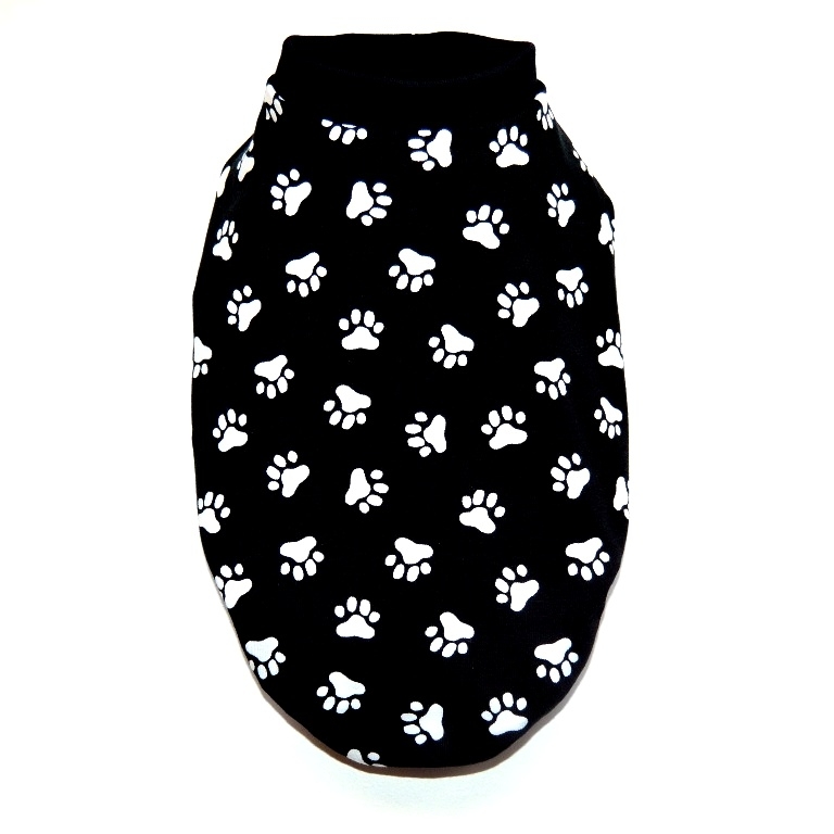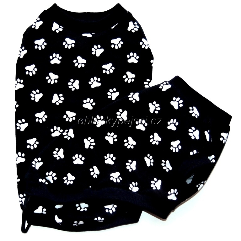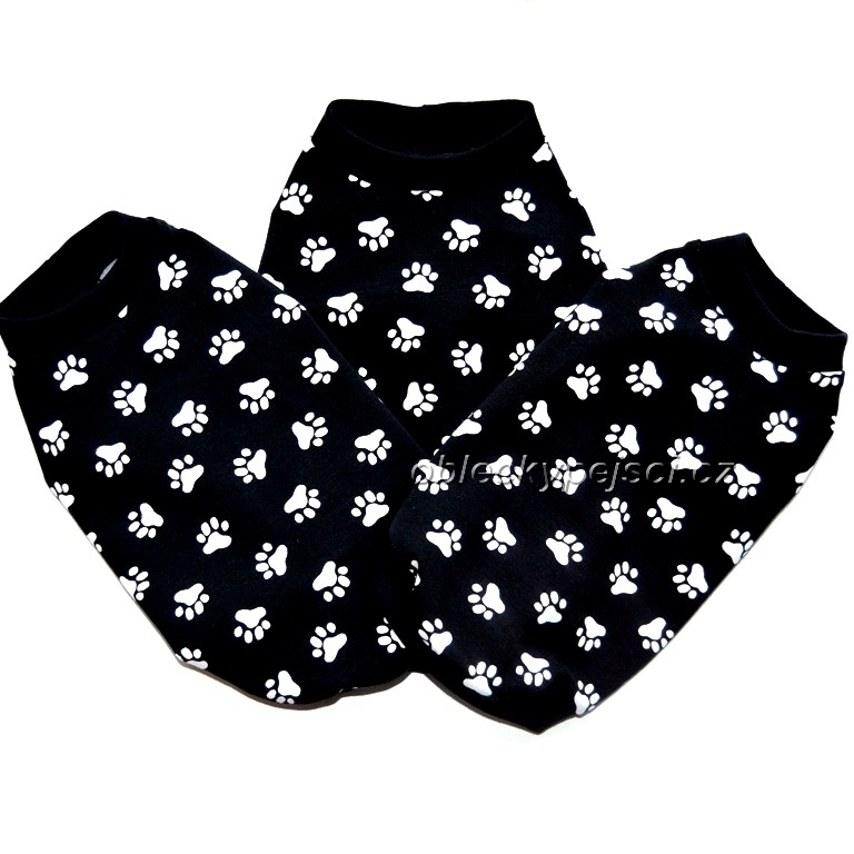 Krásné, černé tričko s motivem bílých tlapiček je ušité z příjemného bavlněného úpletu s černými náplety kolem krku, délky a průramků. Triko nemá zapínání, jen se obléká přes hlavičku pejska. Pro pejsky s vykrojením na bříšku pro bezproblémové venčení. V délce je přišitá gumička na ocásek.