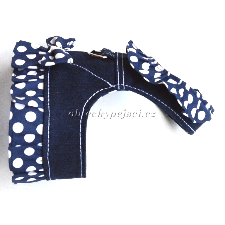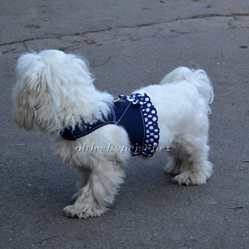 Tmavě modré džínové kšíry s bílými puntíky jsou vhodné pro všechny malé pejsky i štěňátka do jarních až letních dnů.
