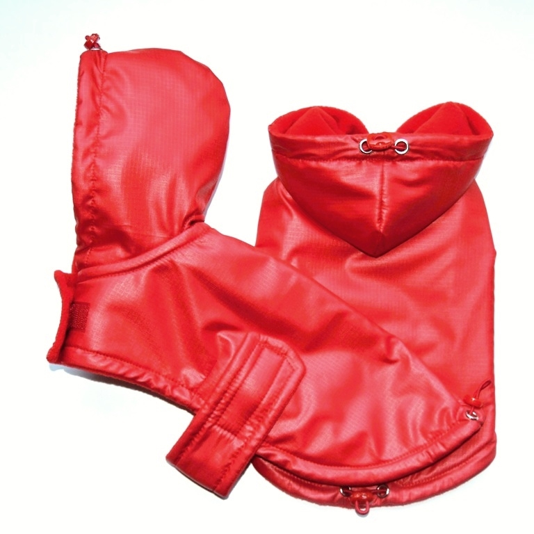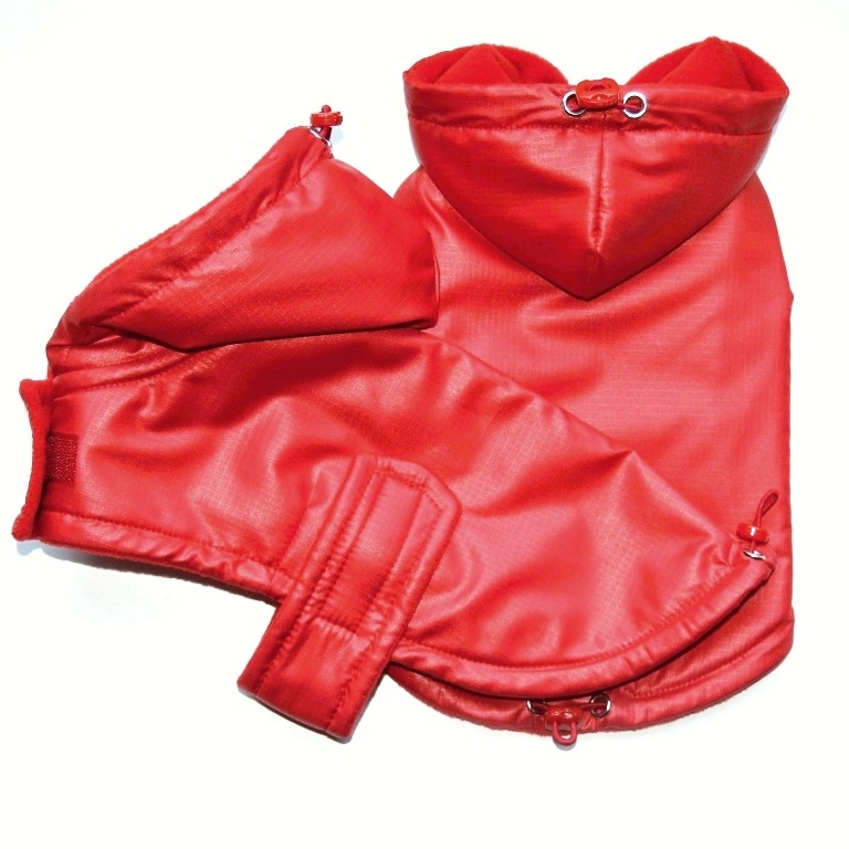 Pláštěnka je ušitá ze slabé sytě červené šusťákoviny, vypodšívkovaná červeným, hřejivým polarfleecem. Pod kapucí je otvor pro připnutí vodítka k obojku. V kapuci a délce je protažená gumička na případné stažení. Velice jednoduše se zapíná pomocí suchých zipů pod krkem a bříšku, díky nim můžete regulovat velikost - viz. rozměry oblečku ve velíkostní tabulce.