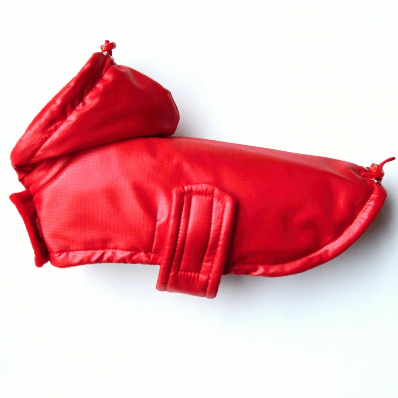 Červená zateplená pláštěnka s kapucí pro malé pejsky i fenečky do jarních a podzimních deštivých dnů co preferují jednoduché oblékání.