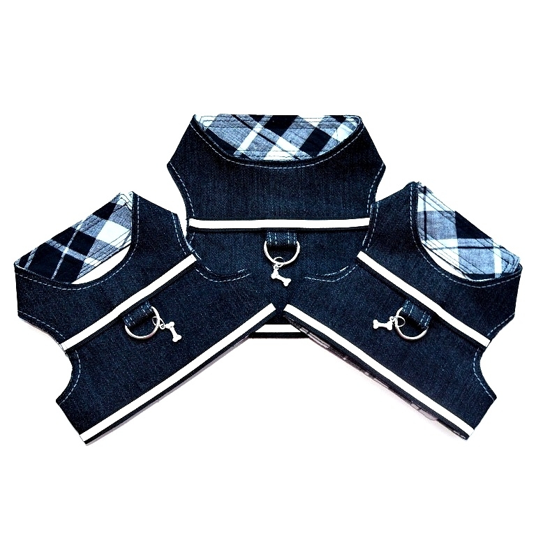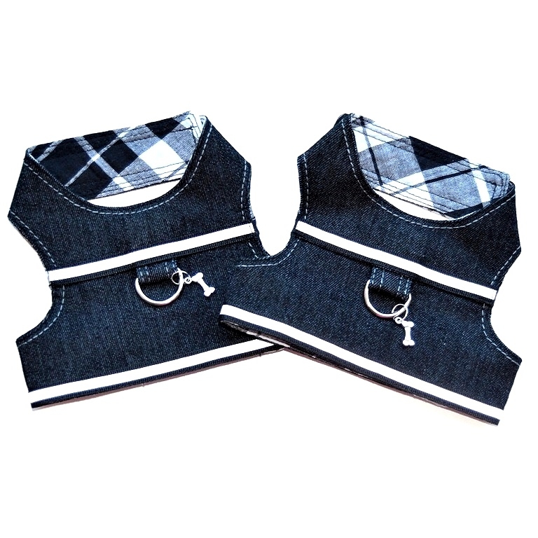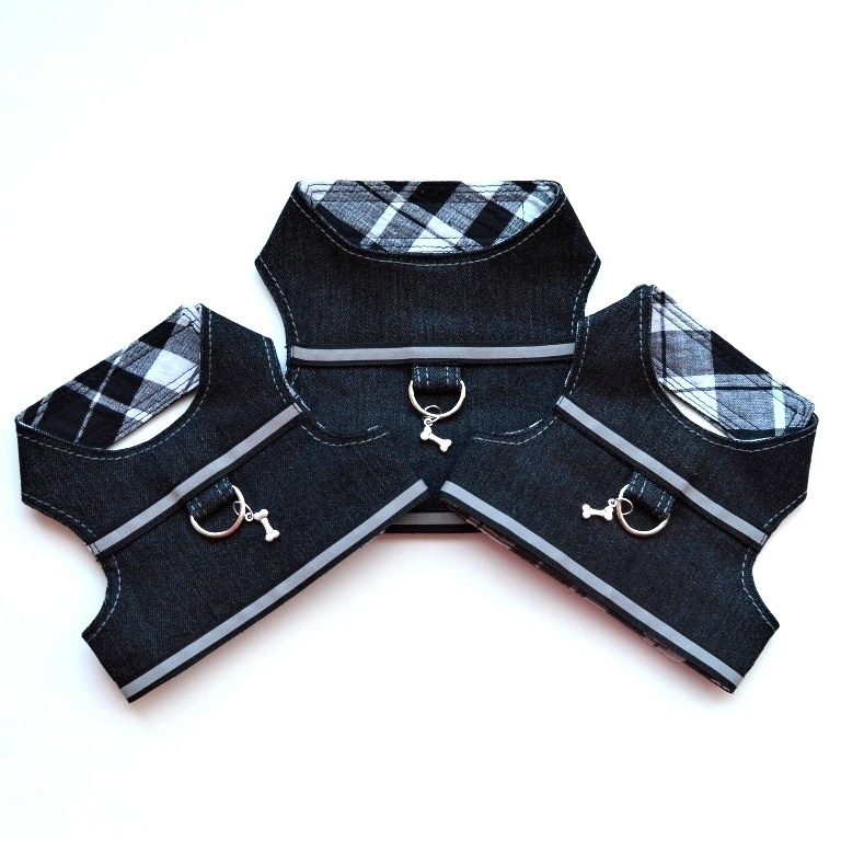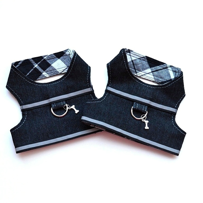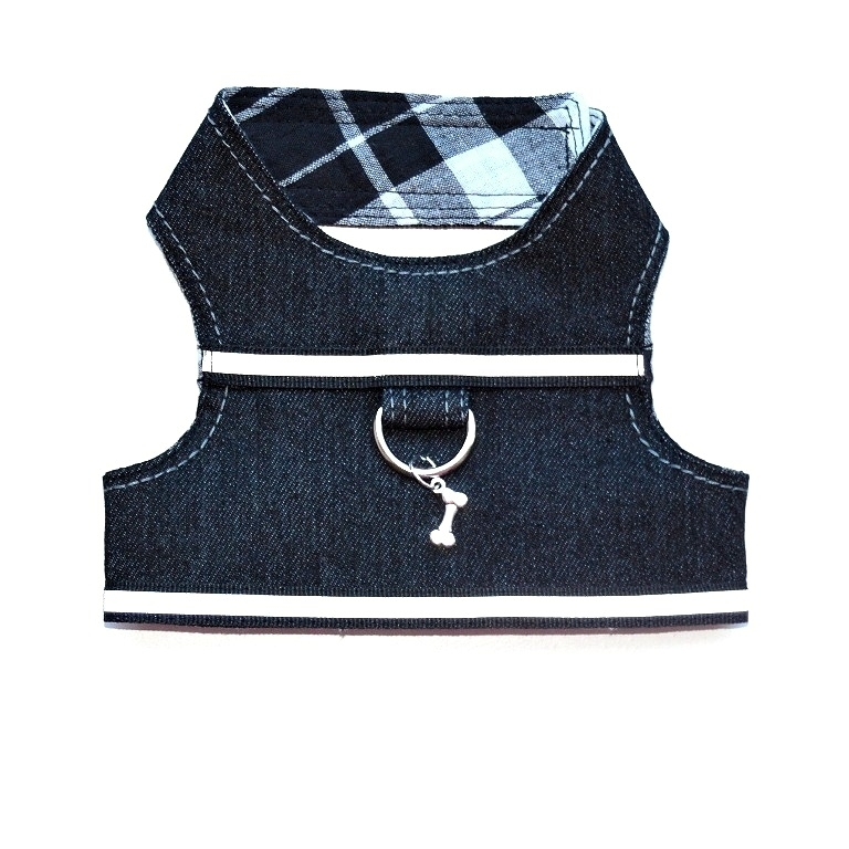 Kšíry jsou ušité z měkké, slabší černé džínoviny podšité velmi slabým bavlněným popelínem s bílo - černým vzorem kostek. Kšíry jsou šedě proštepované, na zádech je všitý polokroužek pro připnutí vodítka, zapínají se velice jednoduše pod krkem a hrudi pomocí suchých zipů ( díky suchým zipům můžete regulovat velikost )