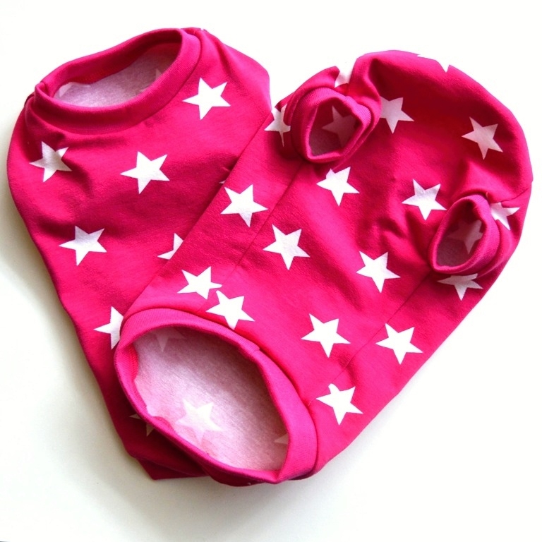 Krásné, bavlněné tričko s motivem bílých hvězdiček je ušité z příjemného, kvalitního bavlněného úpletu s růžovými náplety kolem krku, délky a průramků. Triko nemá zapínání, jen se obléká přes hlavičku pejska. Fenečkám pokrývá celé bříško.