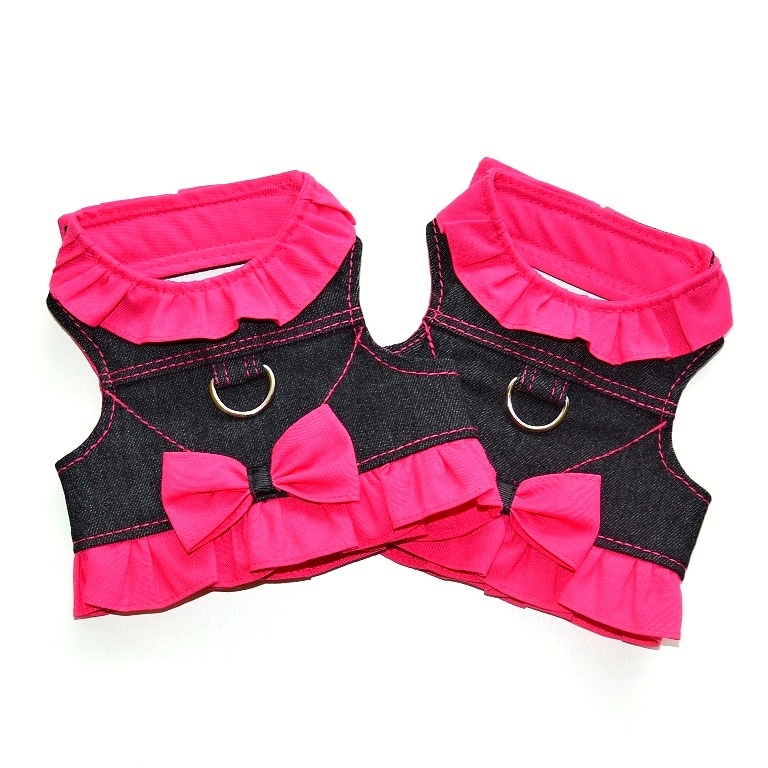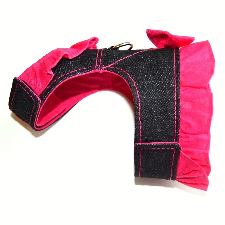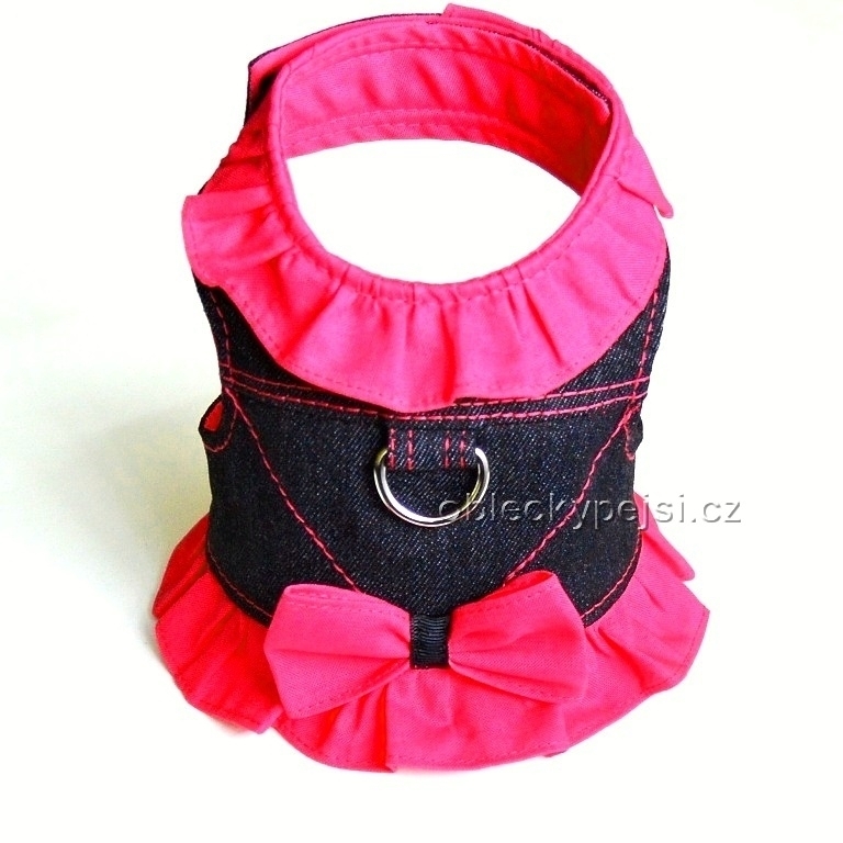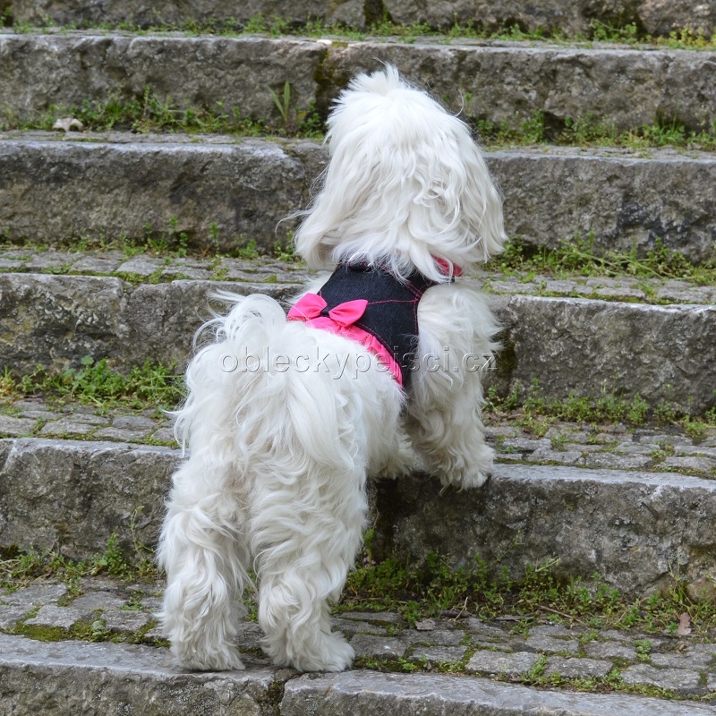 Velmi výrazné a pohodlné kšíry jsou ušité z měkké, slabší černé džínoviny, podšité sytě růžovým bavlněným plátnem, ze kterého jsou i všité volánky kolem krku a hrudi. Na zádech mají všitý polokroužek pro připnutí vodítka a zdobí je přišitá růžová mašlička, také se jednoduše zapínají pomocí suchých zipů pod krkem a hrudi,( díky suchým zipům můžete regulovat velikost ). Tyto kšíry jsou vhodné pro všechny fenečky co nemají rádi obojky a také pro štěňátka, která rychle rostou.